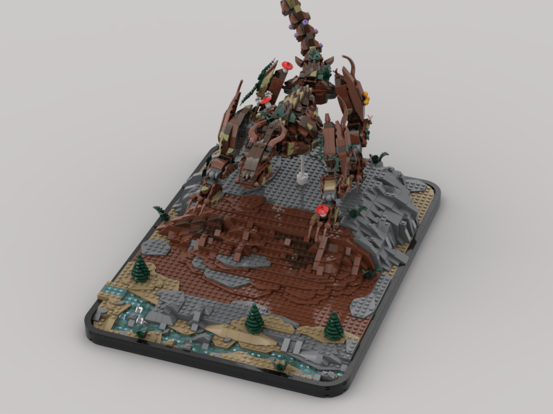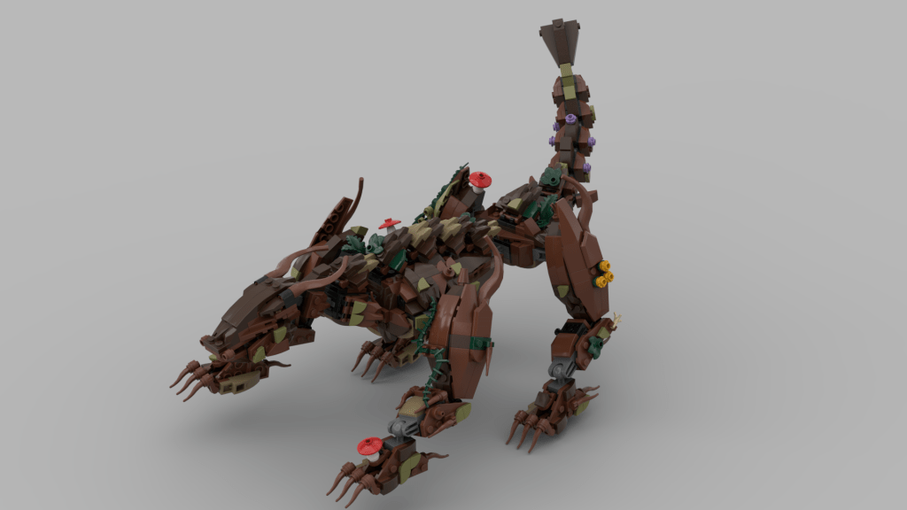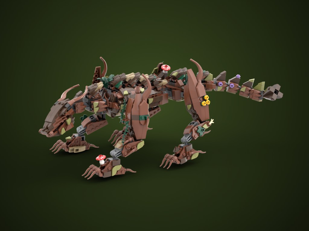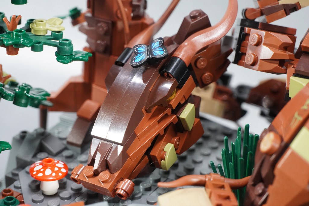 I used mostly reddish brown with lots of dark brown for the foundation. The grey was unavoidable but given it can be interpreted as stone, not the worst outcome. The Dark tan was a nice accent color to break up the spines on its back, I had my heart set in that particular piece, so some contrast helped out a lot. I also was very selective about my greens. As much as I love classic lego green, I wanted the earthy and rich tones. the olive and dark greens top of my list. I dabbed on some red-capped mushrooms for color, to call back to my inspiration toy, and to age the dragon.