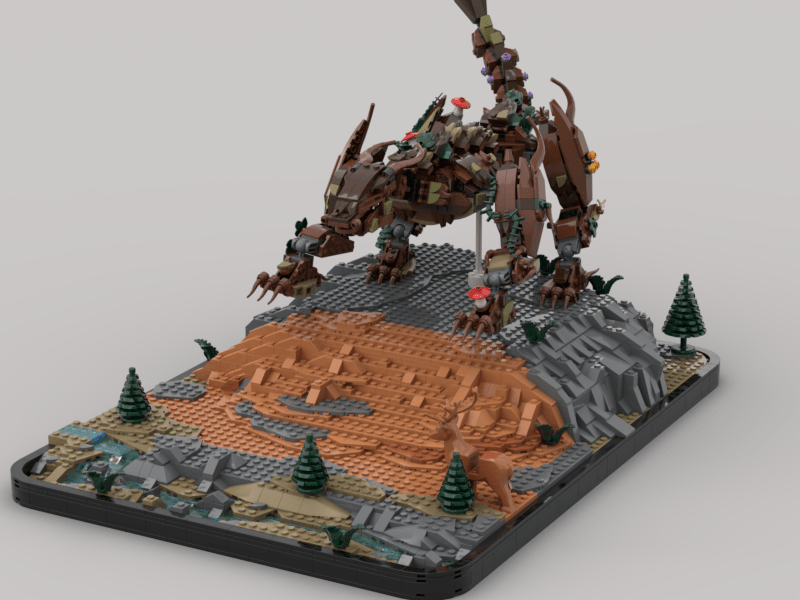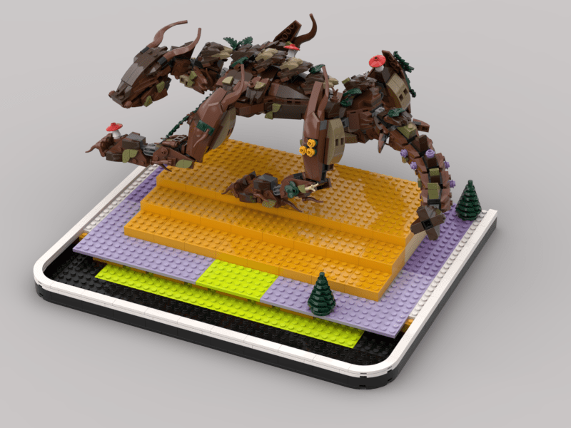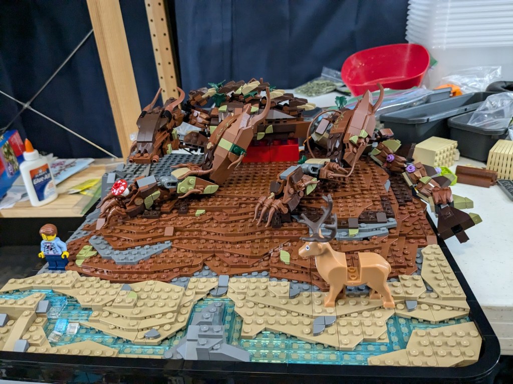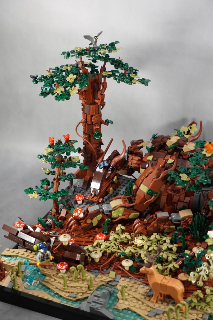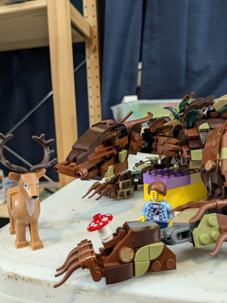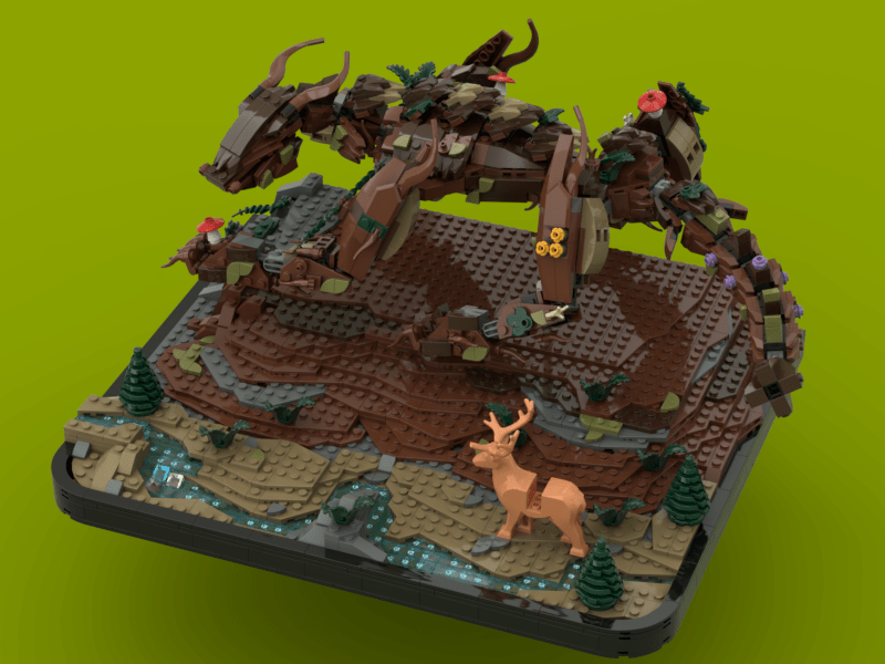 1) Scale. I wanted Wald to be larger than life, a true gentle GIANT. The minifigure and deer are great anchors for the human perspective on size. The average person can conceptualize a minifig is “human sized”. By using that basis, the TRUE size of the dragon becomes understood. How small both the human and deer are, the tress, river, etc. Wald is BIG
