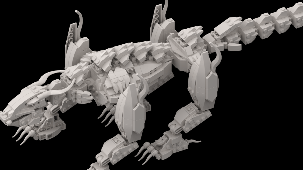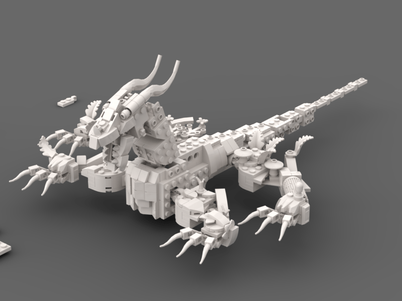 A VERY rough draft. However this pushed me to want to do more. I drowned myself in EVEN more Lego dragons and throwing things at the wall to see what I liked. One AFOL I was very inspired by was “bb-2236549” on bricklink, studying their techniques for the organic skeleton.